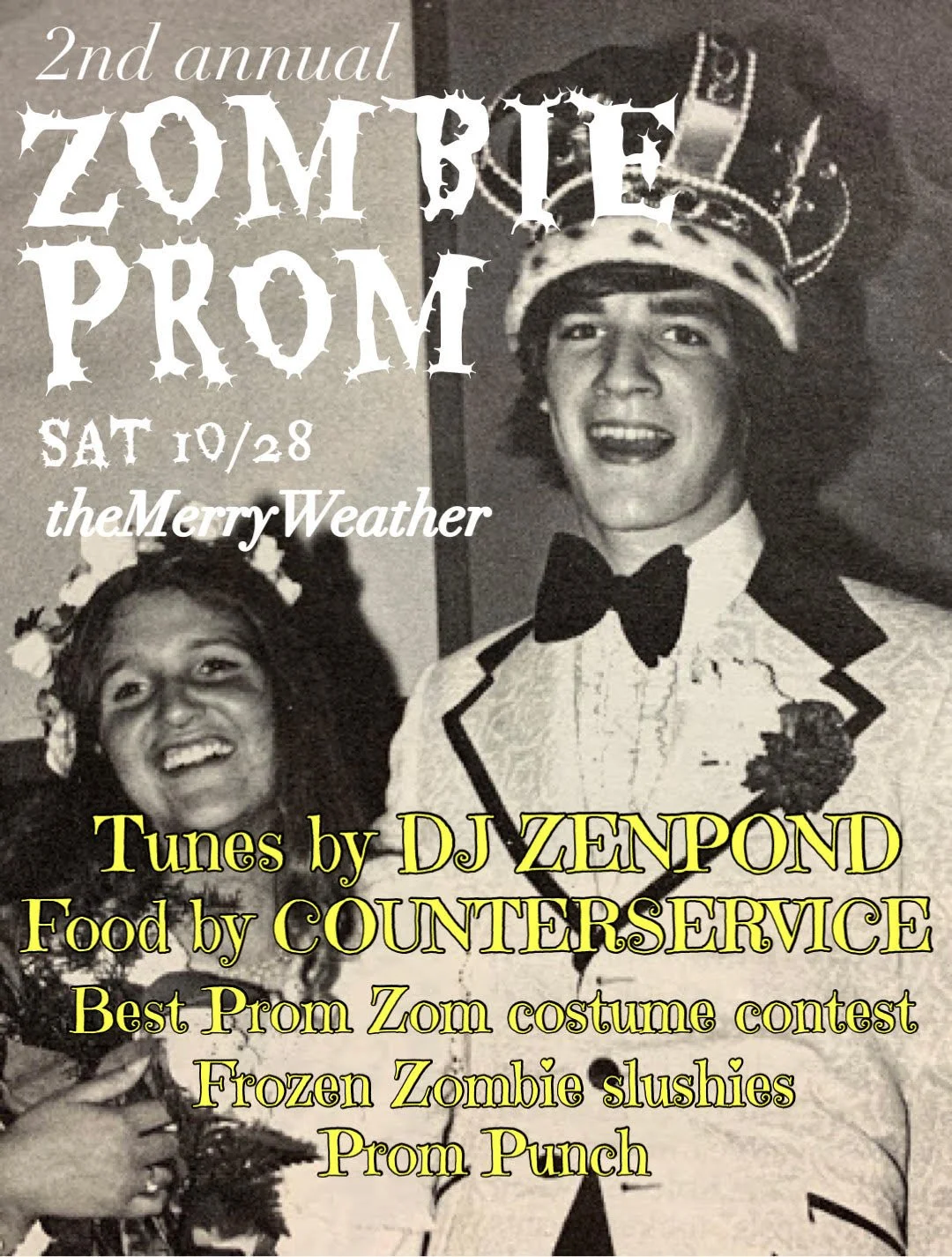 Tunes by DJ Zenpond at 9. Food by CounterService at 7. Prom polaroids and awards for best Zombie prom outfit!